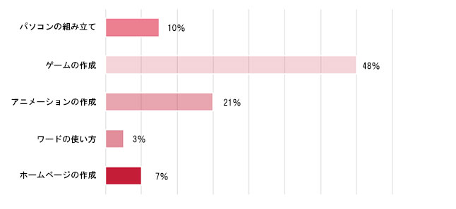前回同様、アニメーションの作成とゲームの作成が人気でした。おやこもの作りたいけんのバージョンアップの参考としていきたいと思います!