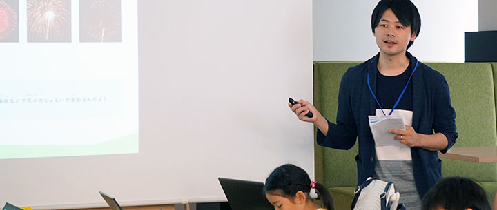 司会の堀部さん(午後の部は横尾さん)の合図で、本物の打ち上げ花火についての学習がはじまります。現役の花火師さんのお話をもとに作成したドリルのため、お父さんやお母さんも一緒に楽しめる内容となっています。